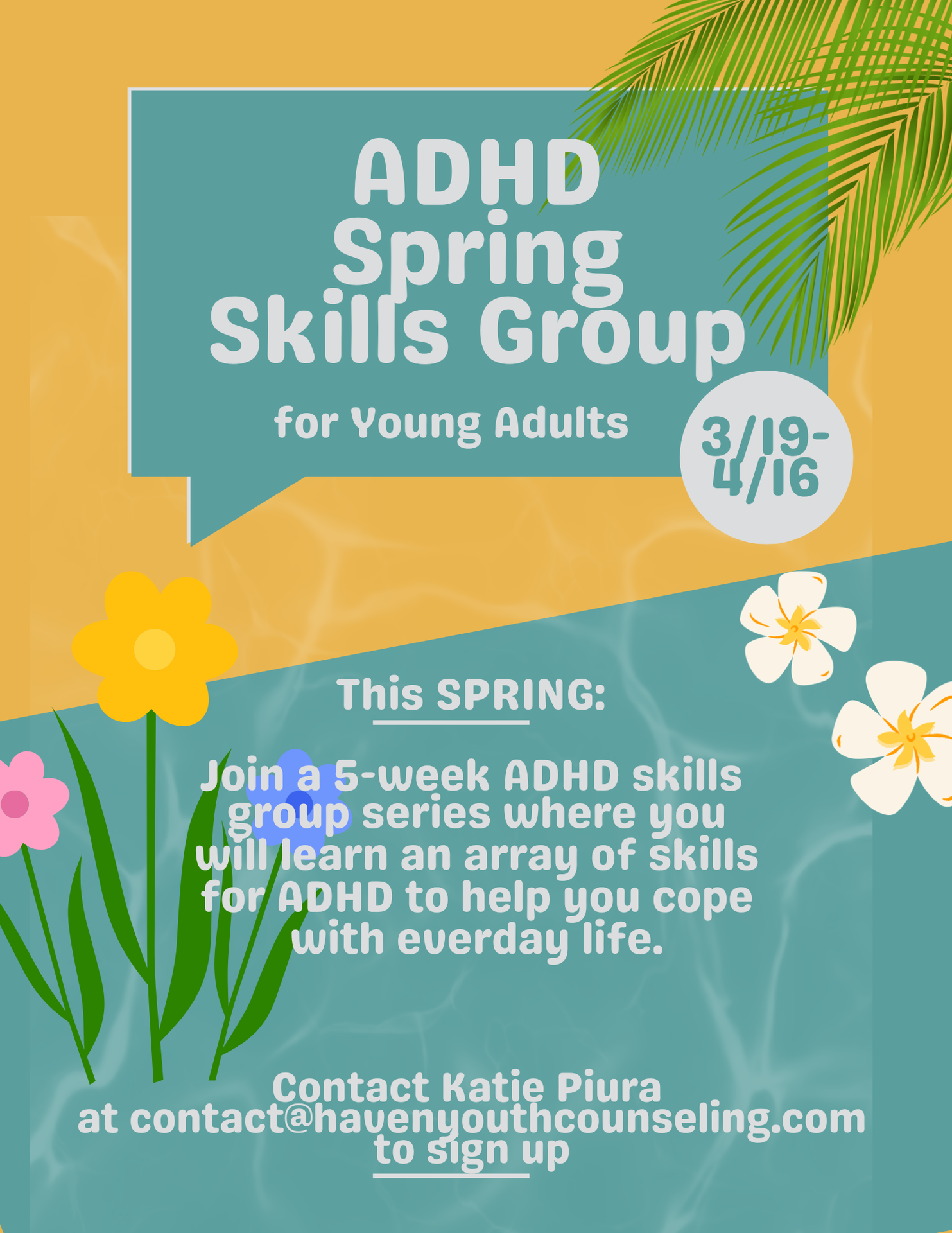 The ADHD Summer Skills Group is a 5-week psychoeducational skills group series offered by Haven Youth Counseling (HYC), a counseling practice. In this group, the therapist facilitator will teach skills on how to cope with symptoms of ADHD.