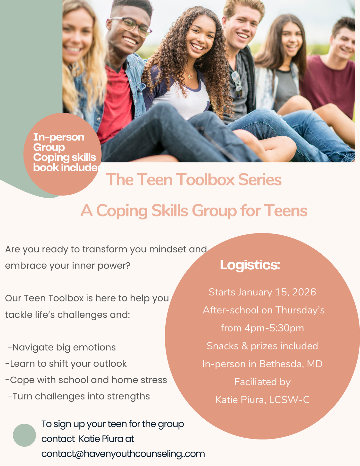 Teen Toolbox Series is a 5-week group for teens ages 14-17. It is slated to begin Thursday January 15, 2026 at 4pm. It will take place after-school from 4-5:30pm . We strongly encourage participants to attend every group session to maintain group cohesion and to get the most out of the group experience.